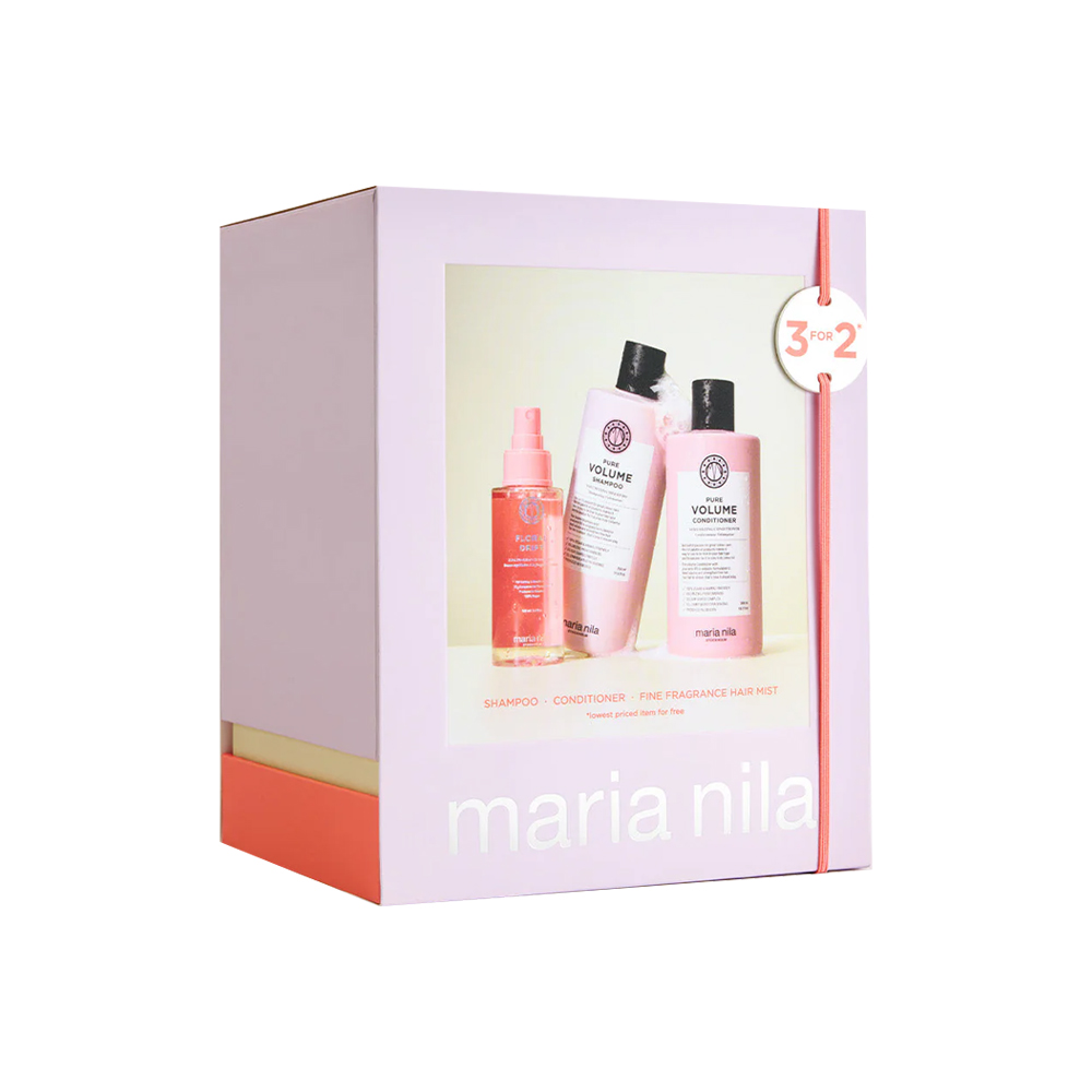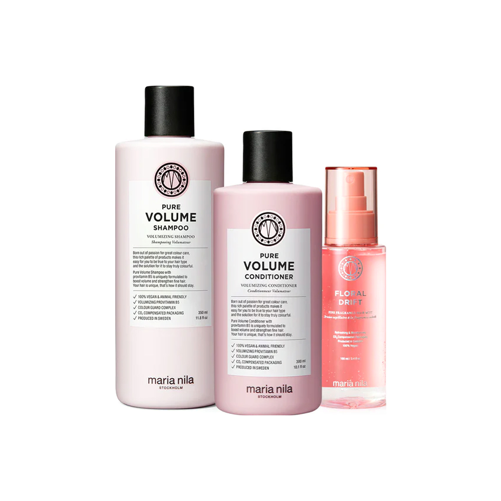 A volume-enhancing haircare kit designed to cleanse and condition fine or flat hair without weighing it down. The shampoo gently removes buildup, the conditioner smooths while maintaining lightness, and the hair perfume adds freshness. When used together, the routine helps hair appear fuller, lighter, and more lifted.